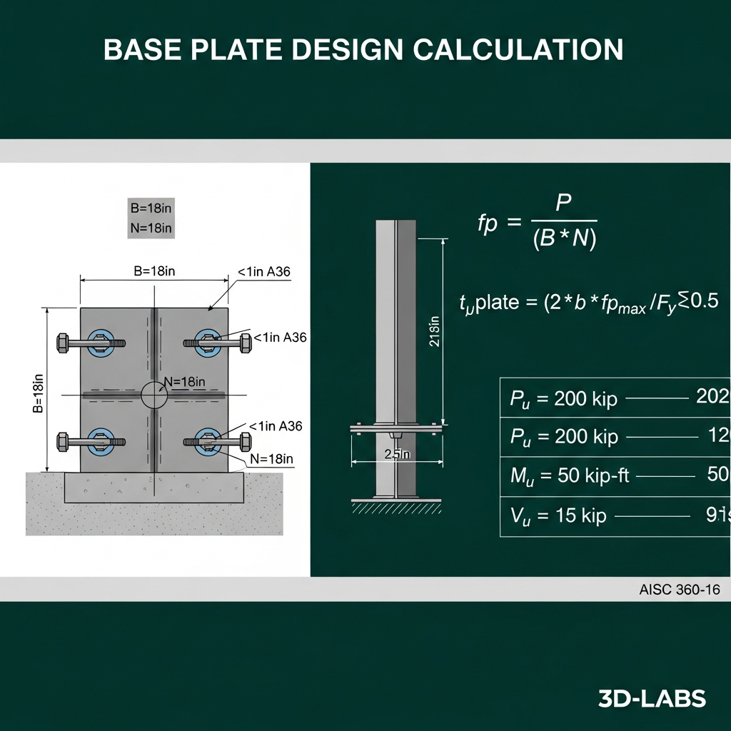 Base plate design calculation spreadsheet per AISC Design Guide 1. Covers concentric load, moment, and combined loading. Calculates plate size, thickness, weld size, and anchor bolt forces.