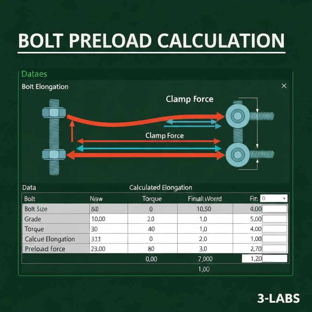 Bolt preload calculation spreadsheet to determine clamping force from applied torque. Includes preload vs torque charts, elongation method, and bolt load loss due to relaxation.