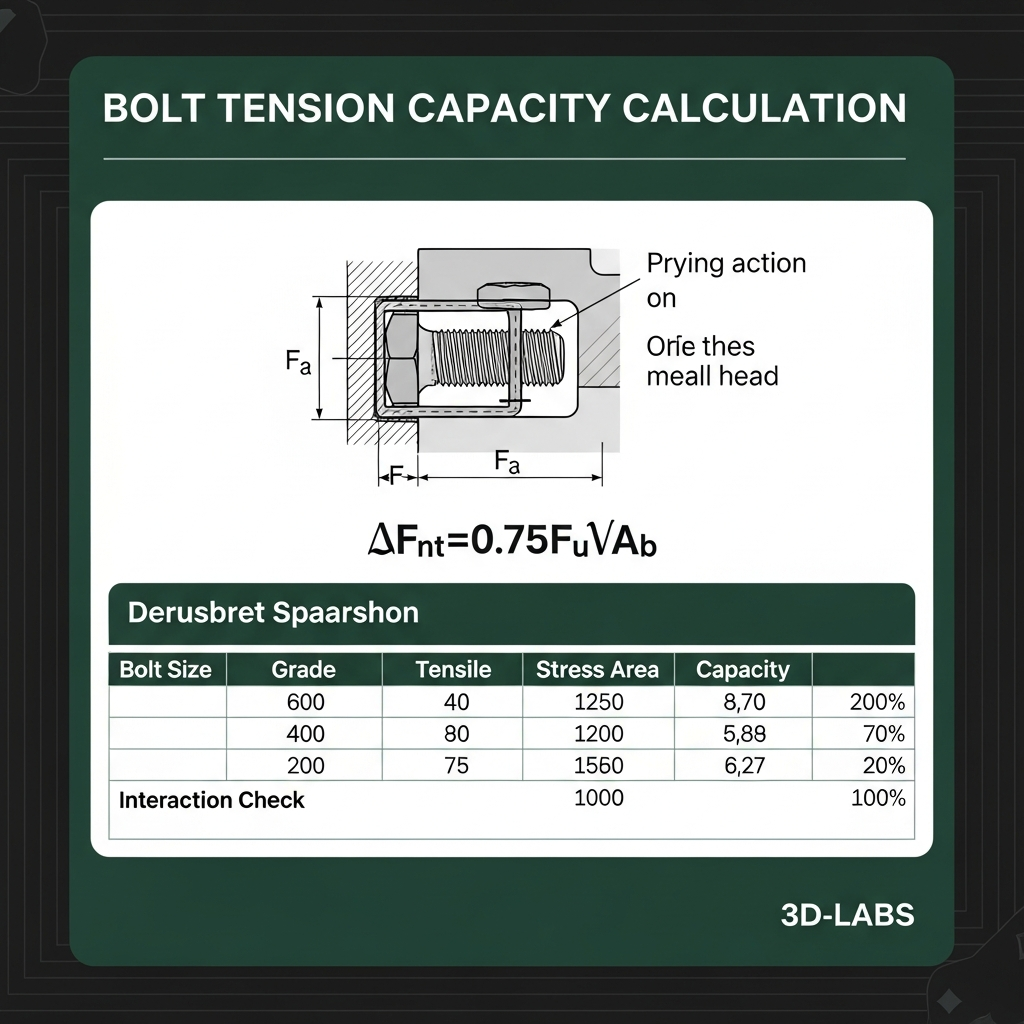 Bolt tension capacity calculation spreadsheet per AISC, IS 800, and ASME standards. Covers proof load, tensile stress area, combined tension-shear interaction, and prying action.