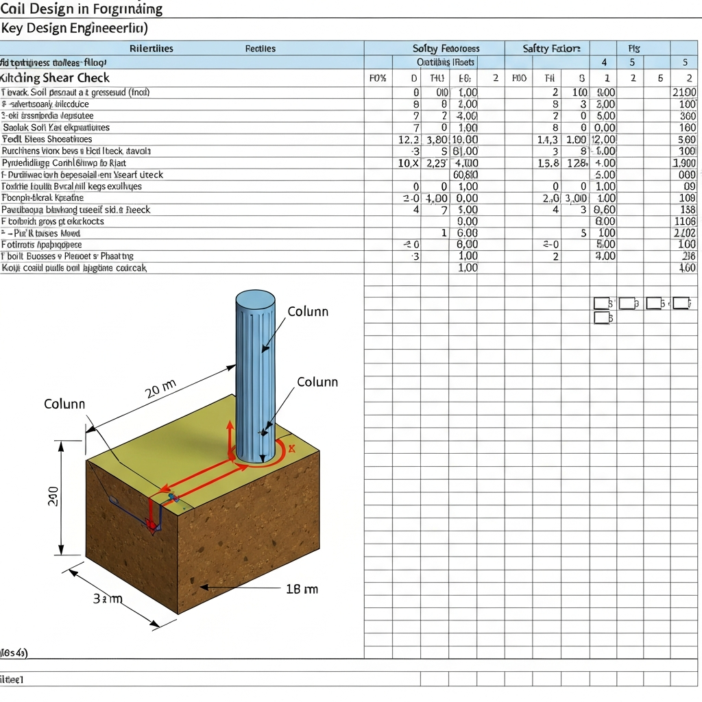 Isolated footing design calculation spreadsheet including bearing capacity, dimensions, and reinforcement design.
