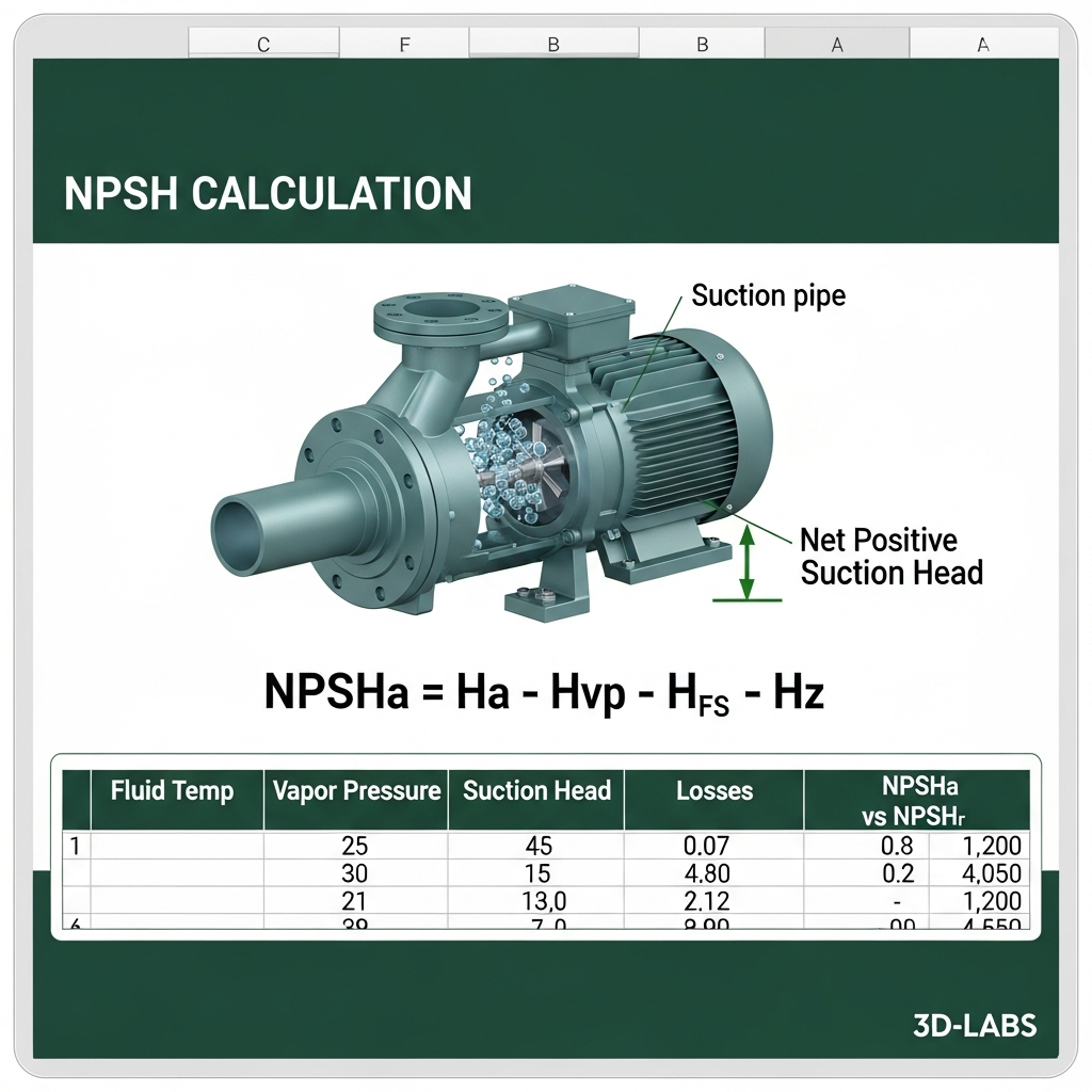 NPSH calculation spreadsheet for pump suction systems. Calculates NPSHa (available) and compares with NPSHr (required). Covers vapor pressure, suction pipe losses, and cavitation check.