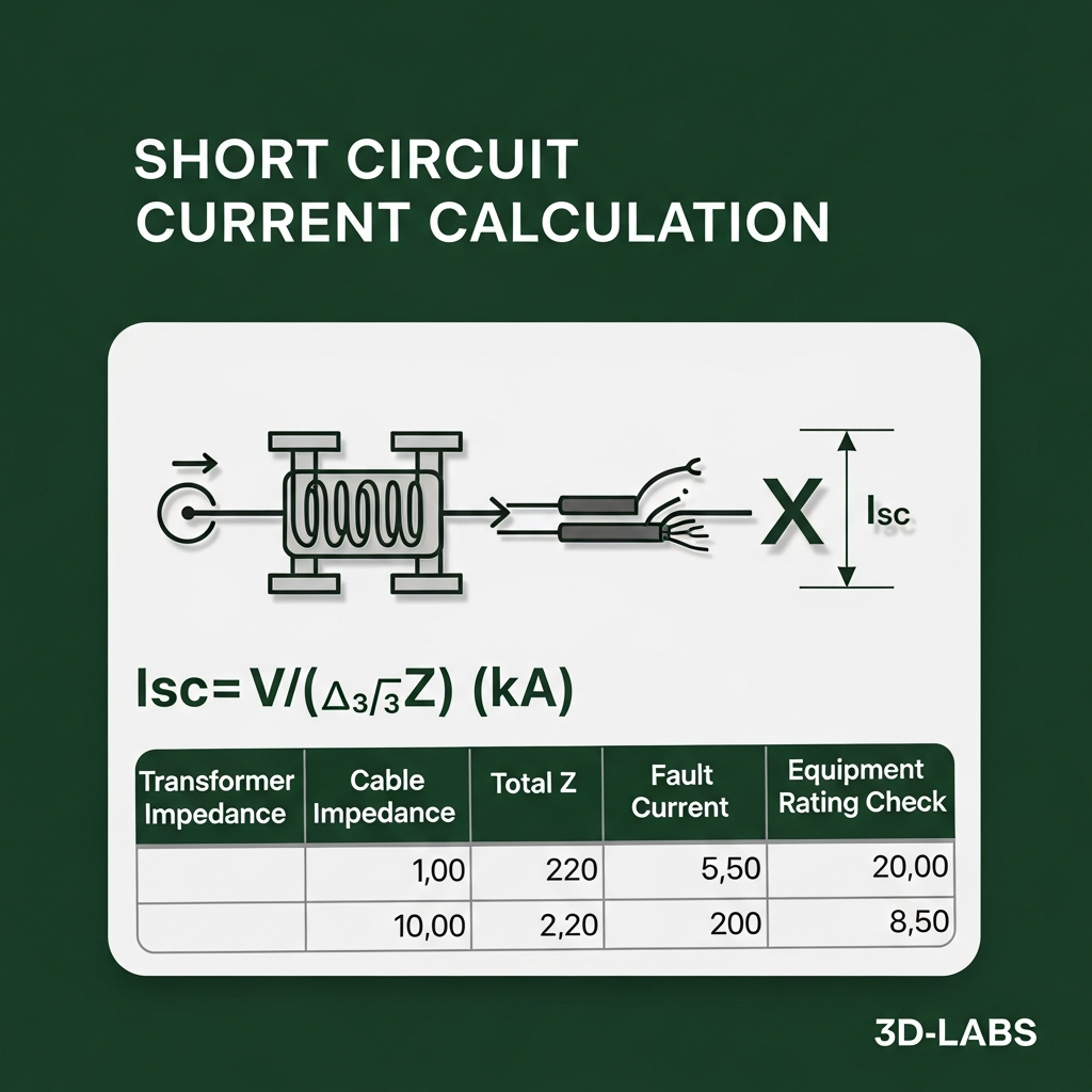 Short circuit current calculation spreadsheet per IEC 60909 and IEEE standards. Covers maximum and minimum fault currents, fault MVA, equipment rating verification, and protection coordination.