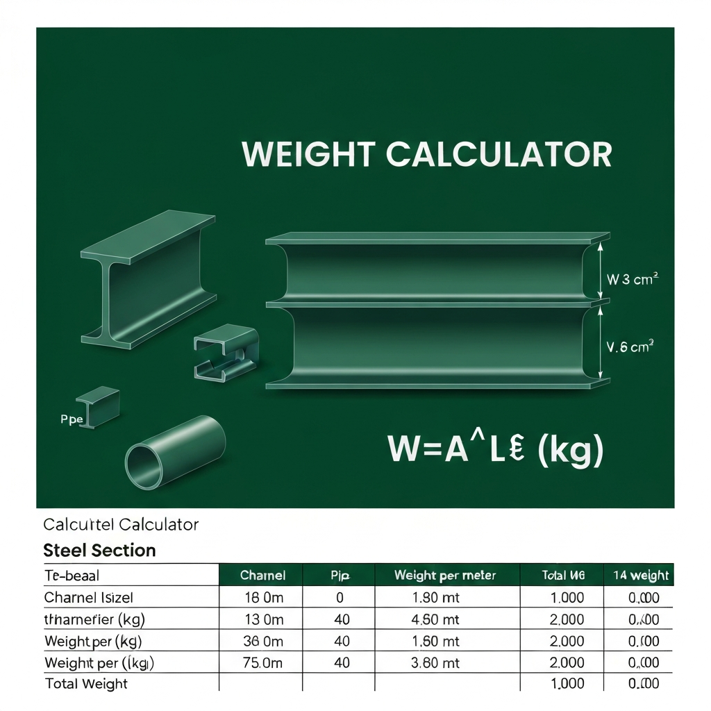 Steel weight calculator spreadsheet for plates, channels, angles, beams, and pipes. Supports MS, SS, and alloy steel densities with automatic weight calculation per meter and total weight.