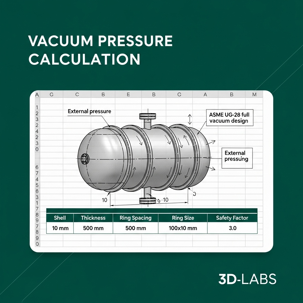 Vacuum pressure calculation spreadsheet for vessels and equipment under external pressure/vacuum service. Covers stiffening ring design, critical vacuum, and collapse pressure per ASME.